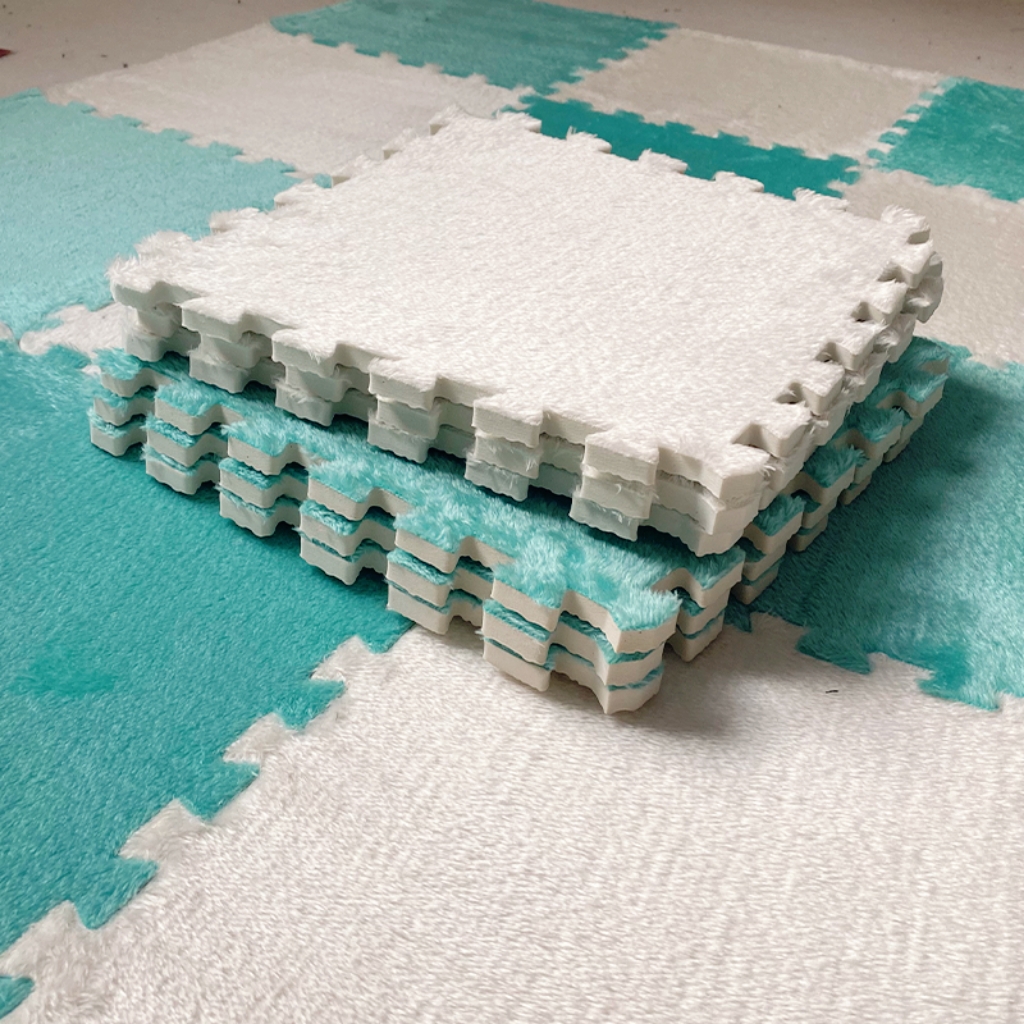 Estas alfombras suelen tener una base de espuma que proporciona una excelente amortiguación y absorción de impactos. La capa textil superior, a menudo hecha de poliéster afelpado u otras fibras suaves, brinda una textura acogedora bajo los pies. El diseño de rompecabezas entrelazado permite un fácil montaje, personalización y reemplazo por parte del usuario, lo que lo convierte en una opción de piso flexible tanto para hogares como para oficinas.